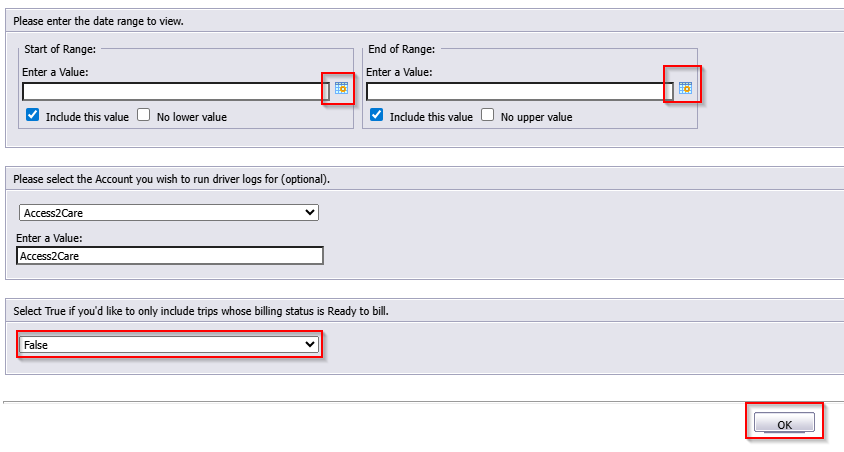 3. Select True if you’d only like to include trips with the ready billing status. By default, False is selected and all trips will populate the report.