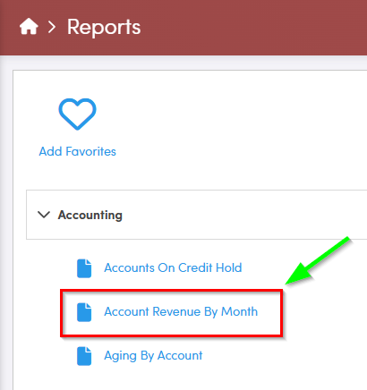 Navigate to the Reporting tab, then select Accounting. Under Accounting select Account by Revenue by Month.