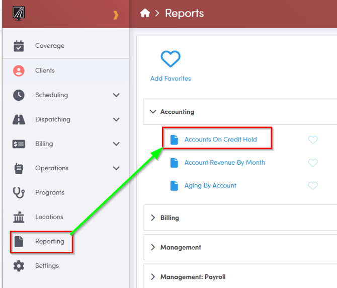 Navigate to the Reports tab, then select the Accounts on Credit Hold.