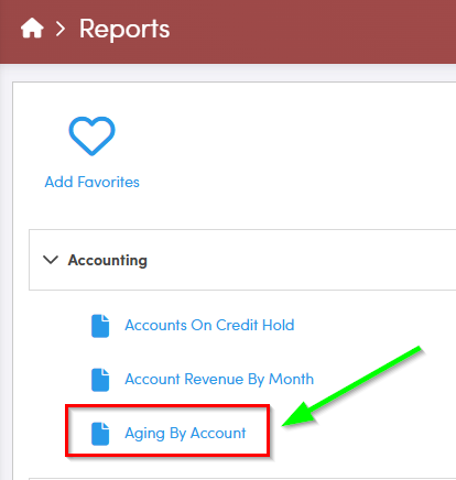 The Aging by Account report allows you to review revenue, current payments owed, and overdue payment by Account or Account Class.
