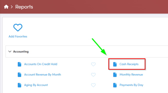 Navigate to the Reporting tab, then select Accounting. Within Accounting select Cash Receipts.