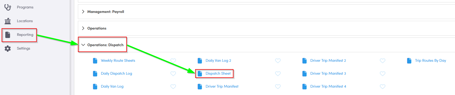 Navigate to the Reporting tab, then select Operations: Dispatch.