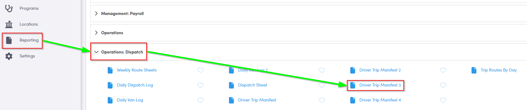 Navigate to the Reporting tab, then select Operations: Dispatch.