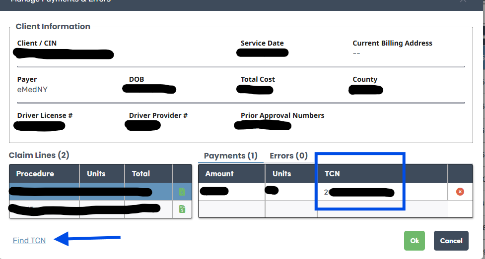 The Manage Payments and Errors window will open. Notice the TCN found under the Payments field. This will take you to the Claim Status File The TCN will be highlighted.