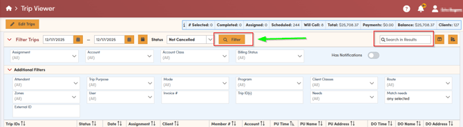 In the Dispatch screen, you can locate specific trips in several ways. You may apply filters to limit the results to trips that match certain criteria, type relevant keywords into the search bar, or scroll through the list of trips to review them manually. After you adjust any filters or enter a keyword, be sure to select **Filter** so the Dispatch Screen updates to reflect your choices.