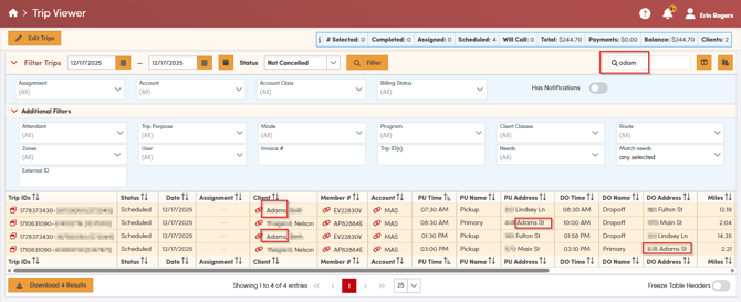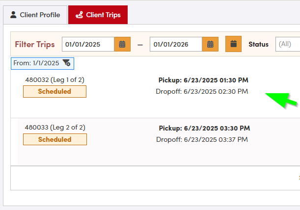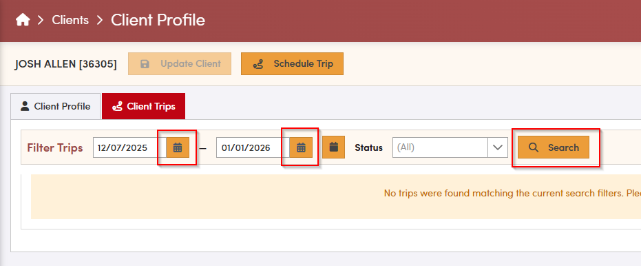 On the **Client Trips** screen, if you do not see the trip you are looking for, you may need to adjust the date range or the types of trips being displayed. Select the appropriate date range for the trips you want to review, and then click **Search** to refresh the list.