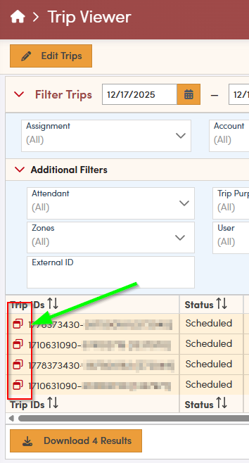 Once you find the trip you are looking for click on the 2 box icon next to the trip ID to open the trip.
