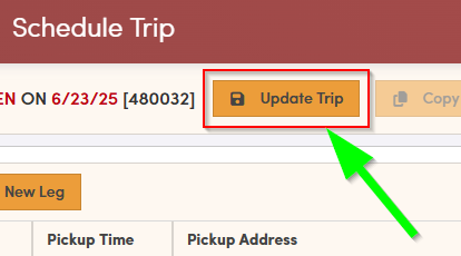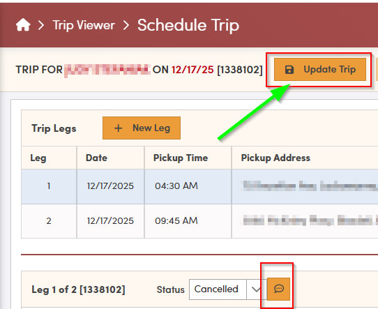 The trip details will open, and the leg you selected will be highlighted. You can now change the status of this highlighted leg. After you choose the appropriate status, be sure to click the **Update Trip** button to save your changes.