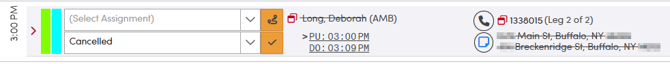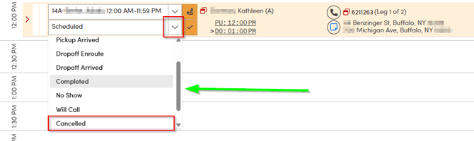 After you select the **Cancelled** status, the trip will be updated. The client’s name and the pickup/drop-off address will appear with a strikethrough, indicating the cancellation. If your status filter is set to anything other than **All**, the trip will no longer appear on the screen once its status is updated to **Cancelled**.