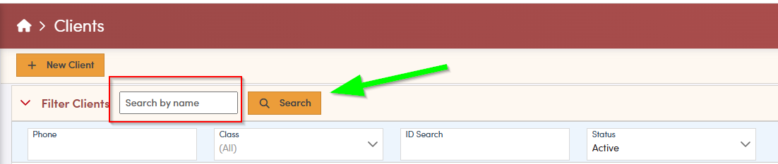 On the client screen, you can search for a client by entering their name in the search bar. To narrow your results, apply additional filters such as phone number, client class, or status. These filters help you quickly identify the correct profile. After selecting your filters, click **Search** to update and refine the client list.