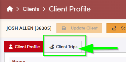 The client profile will open. Select client trips under the client's name to get to their past, present and future trips.