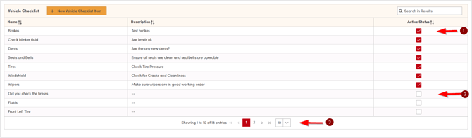 5. Once you have completed adding a vehicle checklist item, you will return to the vehicle checklist screen. It’s important to note that checklist items may not appear in the order in which they were created. Arrow 1 highlights the active status indicator for each checklist item. By clicking this box, as shown by Arrow 2, you can inactivate a checklist item when it is no longer needed. If your list includes more than 10 checklist items, you can use the navigation arrows indicated by Arrow 3 to move through the checklist efficiently.