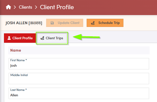 Once you have found the correct Client in your search results, click on their name to open their Client card and review detailed information about them including trip history.