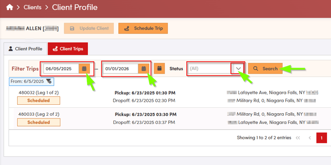 Within the Client Trips tab, you can customize your view by selecting a specific date range and choosing the trip status relevant to your search. Once you have set these filters according to your needs, click the Search button to display a list of trips that match your selected criteria.
