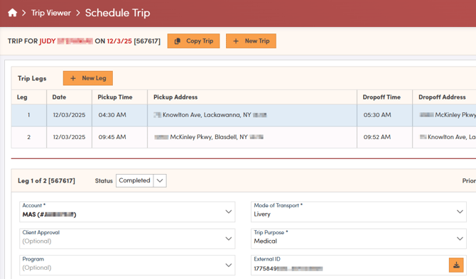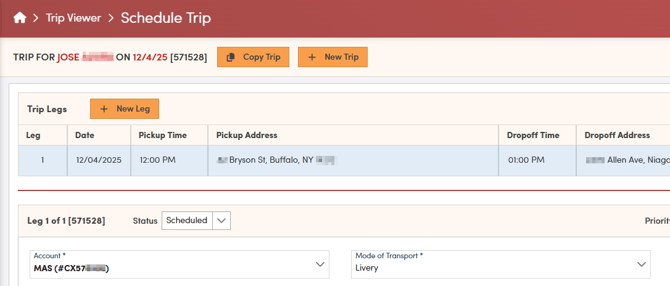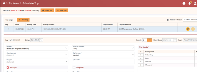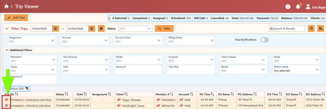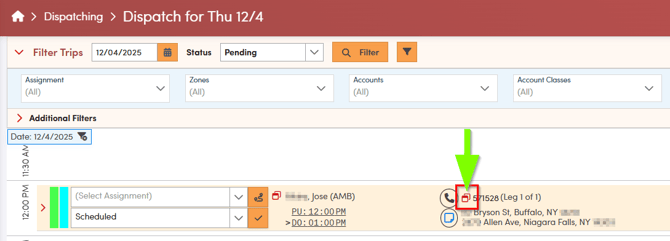 After you have located the trip you need, select the icon with two red boxes next to the telephone icon to open and review the trip details.