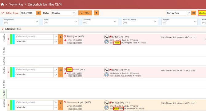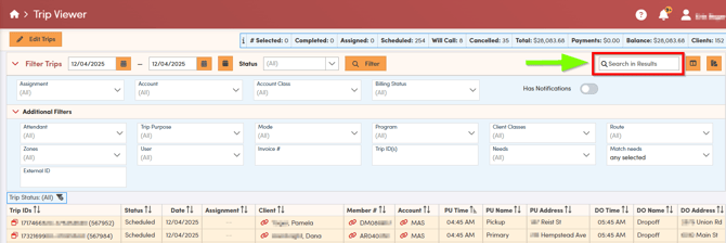 On the Dispatch screen, searching for trips is straightforward. Simply select the date that you would like to search and enter the Client Name into the Search in Results field to display trips associated with that Client on that day.