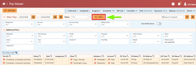 After selecting your search criteria or typing in the Search in Results bar select Filter to filter results. When using the search bar results may populate without selecting filter. The search bar can be used to search for names, addresses and trip ID's.
