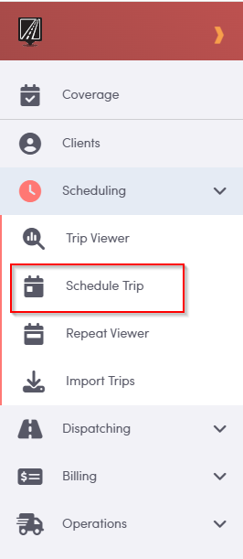 To begin, locate the Scheduling menu on the left-hand side of your screen and click on “Schedule Trip.”