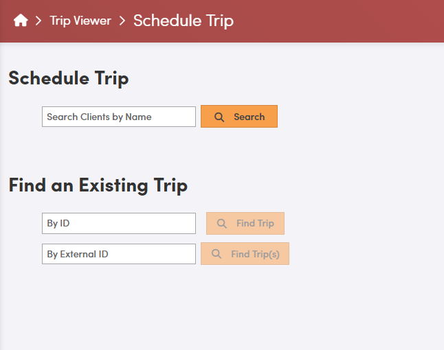 In the Schedule Trip window, you’ll see options to search for an existing trip by entering either the Trip ID or the External ID.