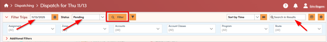 You can further refine your search by adjusting Filter Trips options such as Date and Trip Status. After selecting the appropriate filters, click the Filter button to update the list and view only the trips that match your criteria. By applying these filters, the Dispatch screen will display only the trips that match your selected criteria.
