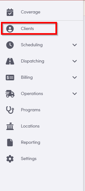 To view trips associated to a specific Client, first, navigate to the left-hand menu bar and select “Clients.”