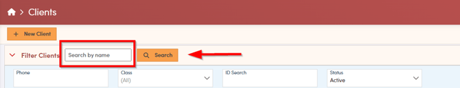 You can also search for Clients using additional filters such as Phone Number, Class, ID, and Status. By default, the search will display Clients with an Active status; however, you can also view clients who are Inactive, On Hold, or All Clients by adjusting the Status filter options.