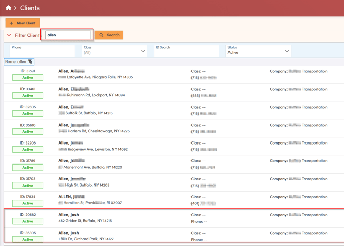NOTE: To accurately identify the intended client, always verify additional details such as phone number, class, or client ID beyond just the name. This practice helps ensure you are selecting the correct client record.