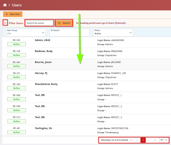 The user screen will open in a new window. If you have many users, you may need to move between pages using the arrows at the bottom of the screen. You can also locate a specific user by searching by name or applying additional filters. To search, enter the first name, last name, or both in the search bar, and then select **Search**. Once you have located the user you are looking for click anywhere on the bar with their name.