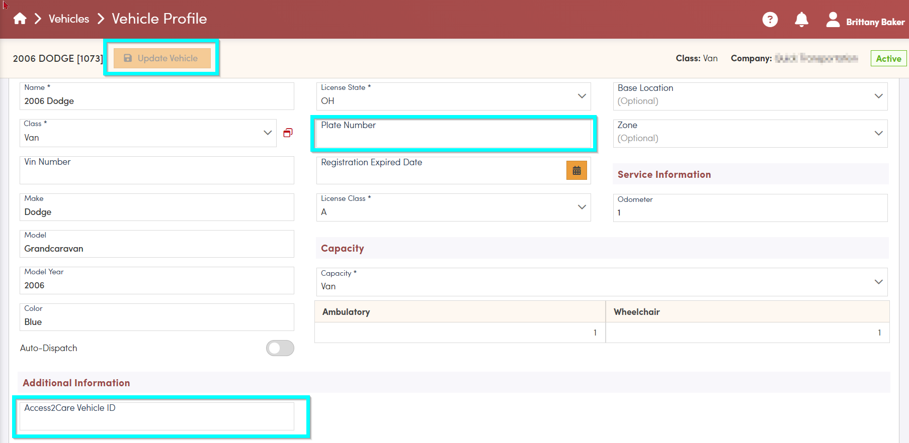 From there, scroll down to the Additional Details and update the Access2Care Vehicle ID, as shown below. Make sure the Plate number also matches your Access2Care portal.