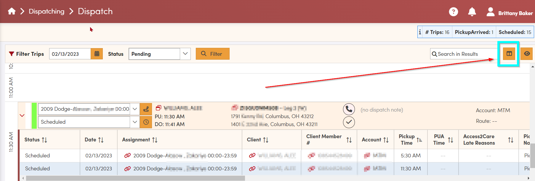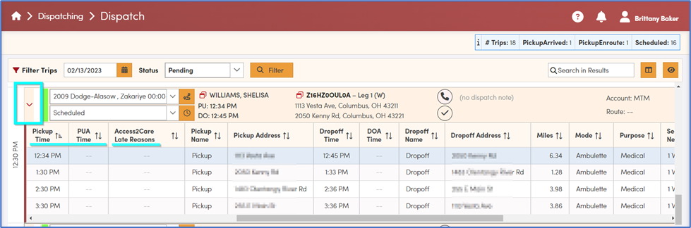 To see this information in Dispatch, click the down arrow on the left of the trip and compare the scheduled Pickup Time with the PUA (Pick Up Actual) time. If the Access2Care trip is over one minute late, be sure to add the Late Reason.