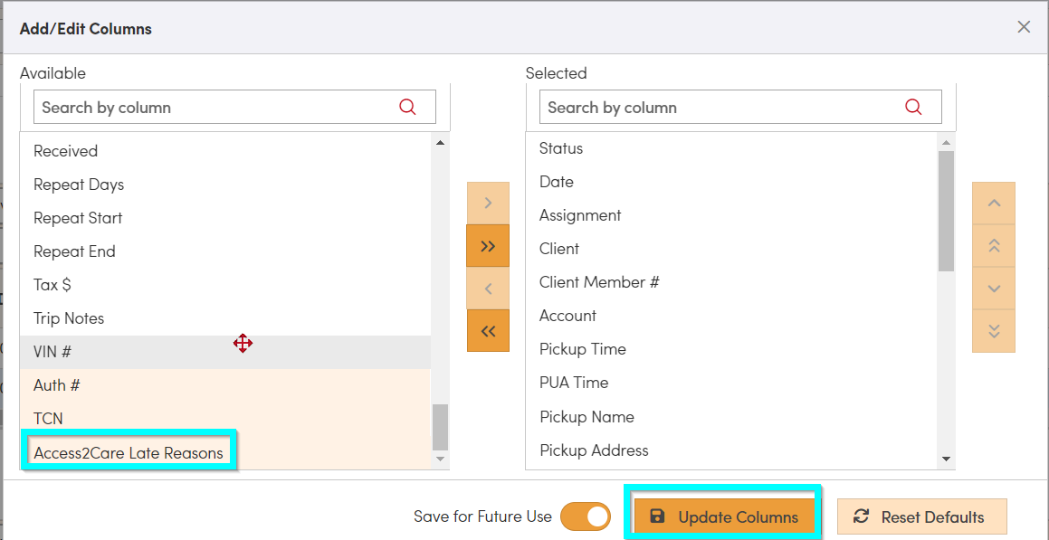 From the pop-up, find Access2Care Late Reasons from the left, Available columns.