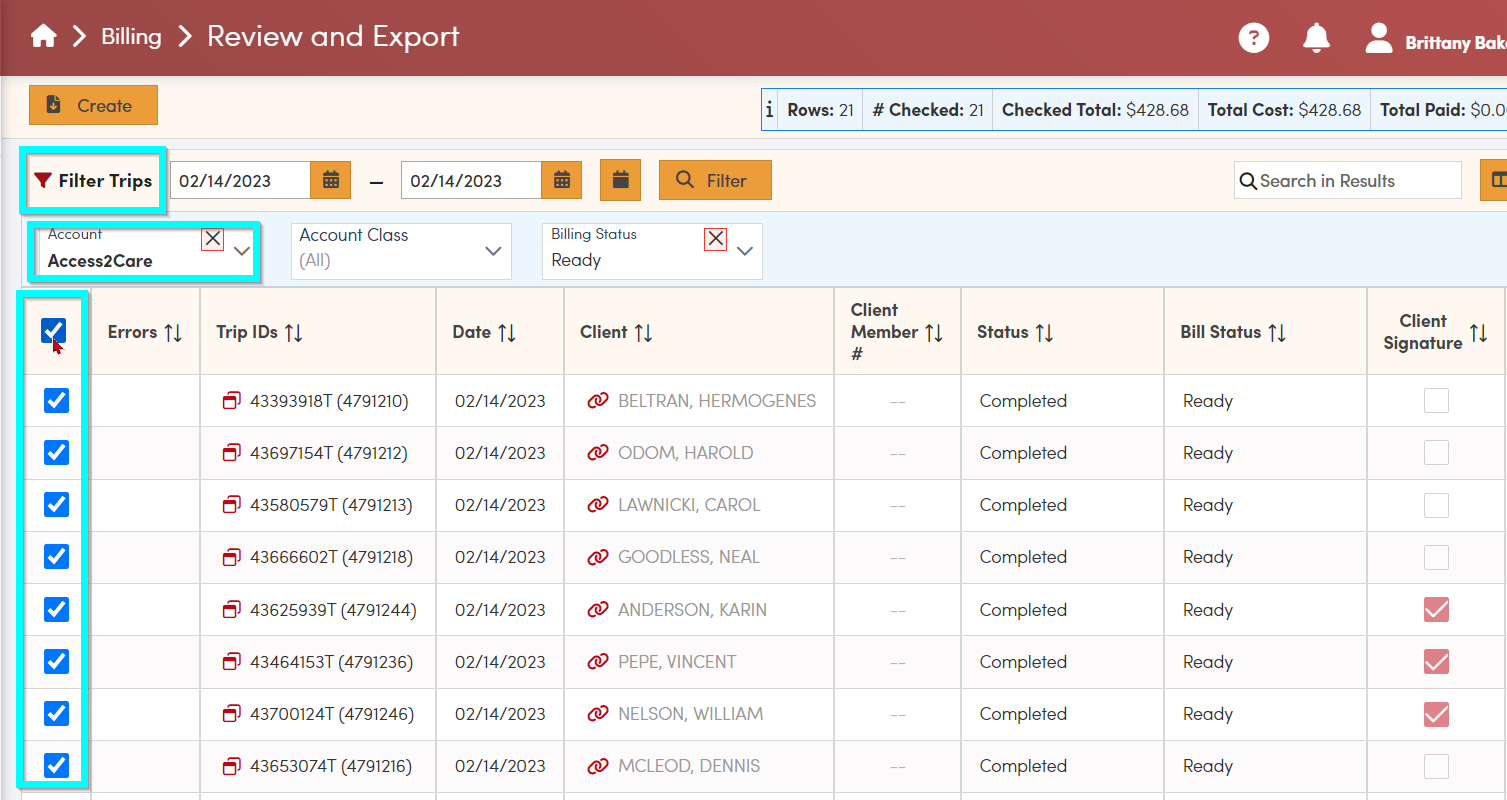 When you're ready to bill, RoutingBox Web can generate a file with your completed trip information in a format specific to Access2Care.