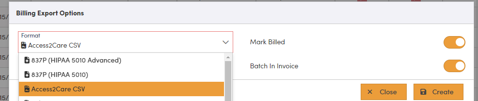 Choose Access2Care CSV from the popup, and click Create. Shown Below