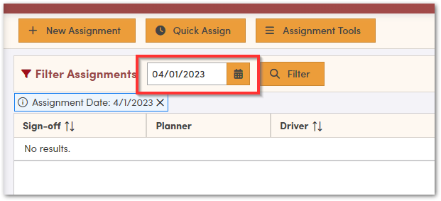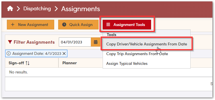 Click on Assignments Tools and Copy Driver/Vehicle Assignments From Date