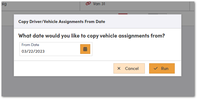 Click the Run button. The Assignment information will now be copied over from the date you selected provided the driver and vehicle are both available.
