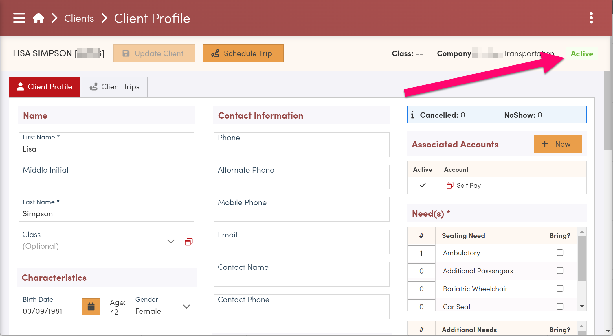 - Active: This is the default status of a client record. Active clients can have trips scheduled and will show up throughout RoutingBox when performing a search, dispatching trips or running reports.