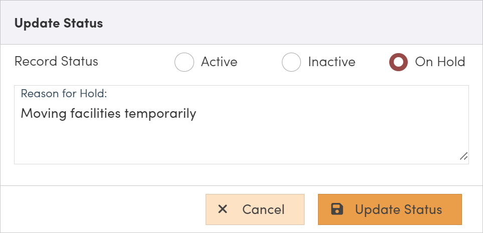 Click on the status to open the "Update Status" window. Select the status you want to update the client to and then click "Update Status". If you select "On Hold" you can optionally add a "Reason for Hold" note to the client record.