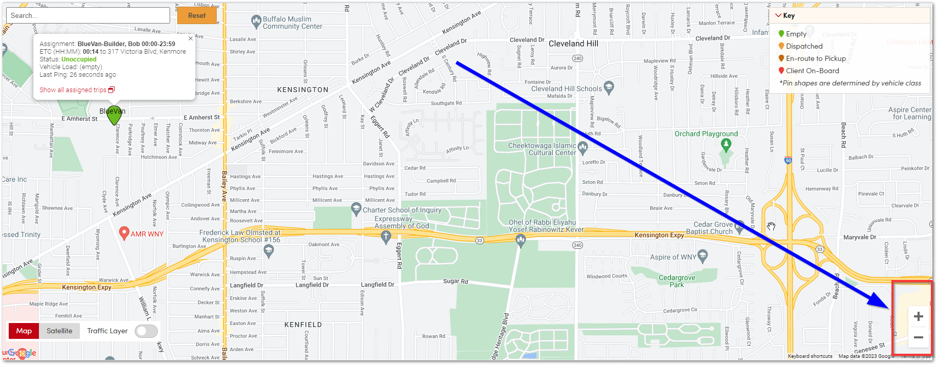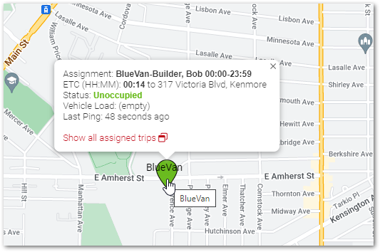 The markers on the screen display the vehicle number. Hovering over the marker will display information about that vehicle’s current Assignment, ETC (estimated time to completion), Status, Vehicle Load, and Last Ping.