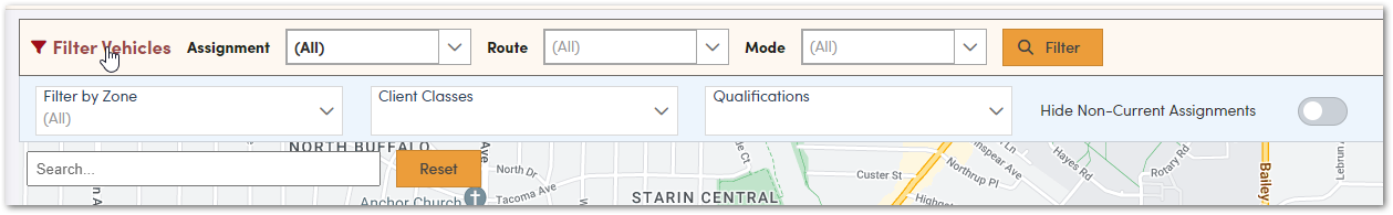 The map can be filtered to display vehicles based on Assignment, Mode, Route, Zone, or Qualification by clicking on Filter Vehicles.