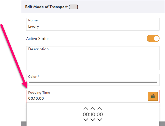 At the bottom of the Edit Mode of Transport window, add in the Padding Time (HOURS:MINUTES:SECONDS) and click Update: