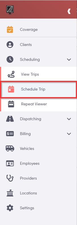 To begin scheduling a new trip, hover your mouse over the left-hand pull-out menu and click “scheduling”, then “Schedule Trip”.
