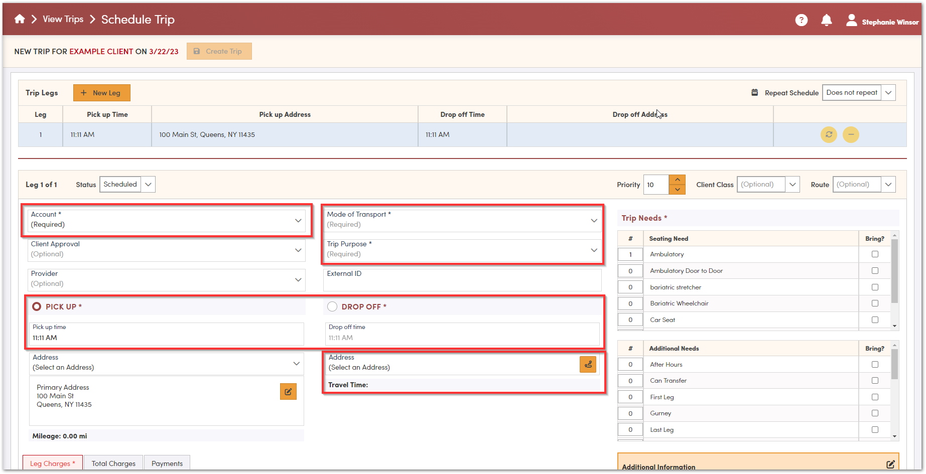 Click on the clients name to begin scheduling the first leg of this trip. Fill out the required fields marked by an asterisk including Account, Mode of Transport, Trip Purpose and Seating Needs.