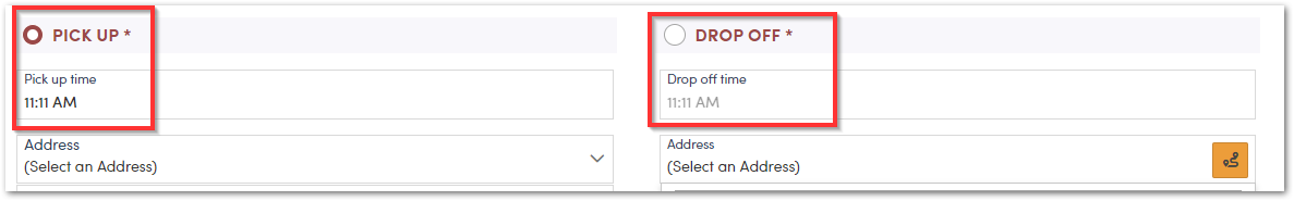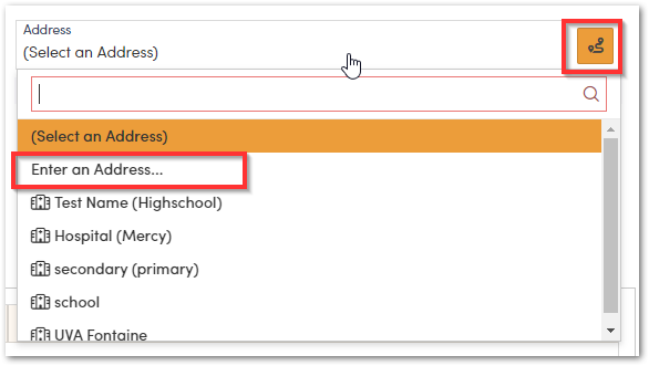 Next, Select an Address for Drop off. If the drop off address is a saved location select that from the list. If not, click on either 'Enter an Address' or the orange enter an address icon.