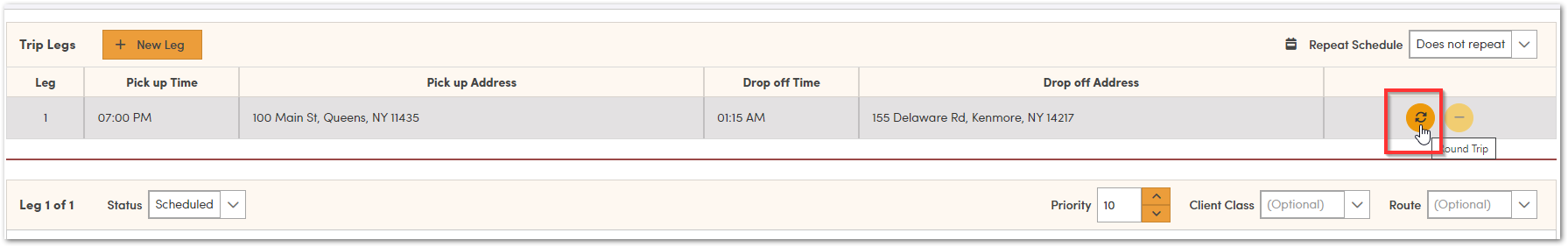 To add a Return Ride, click the Round Trip Icon icon.