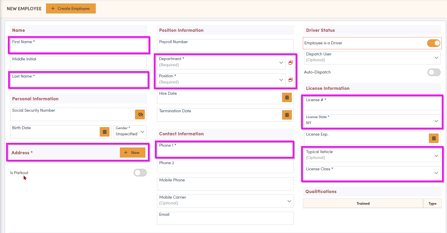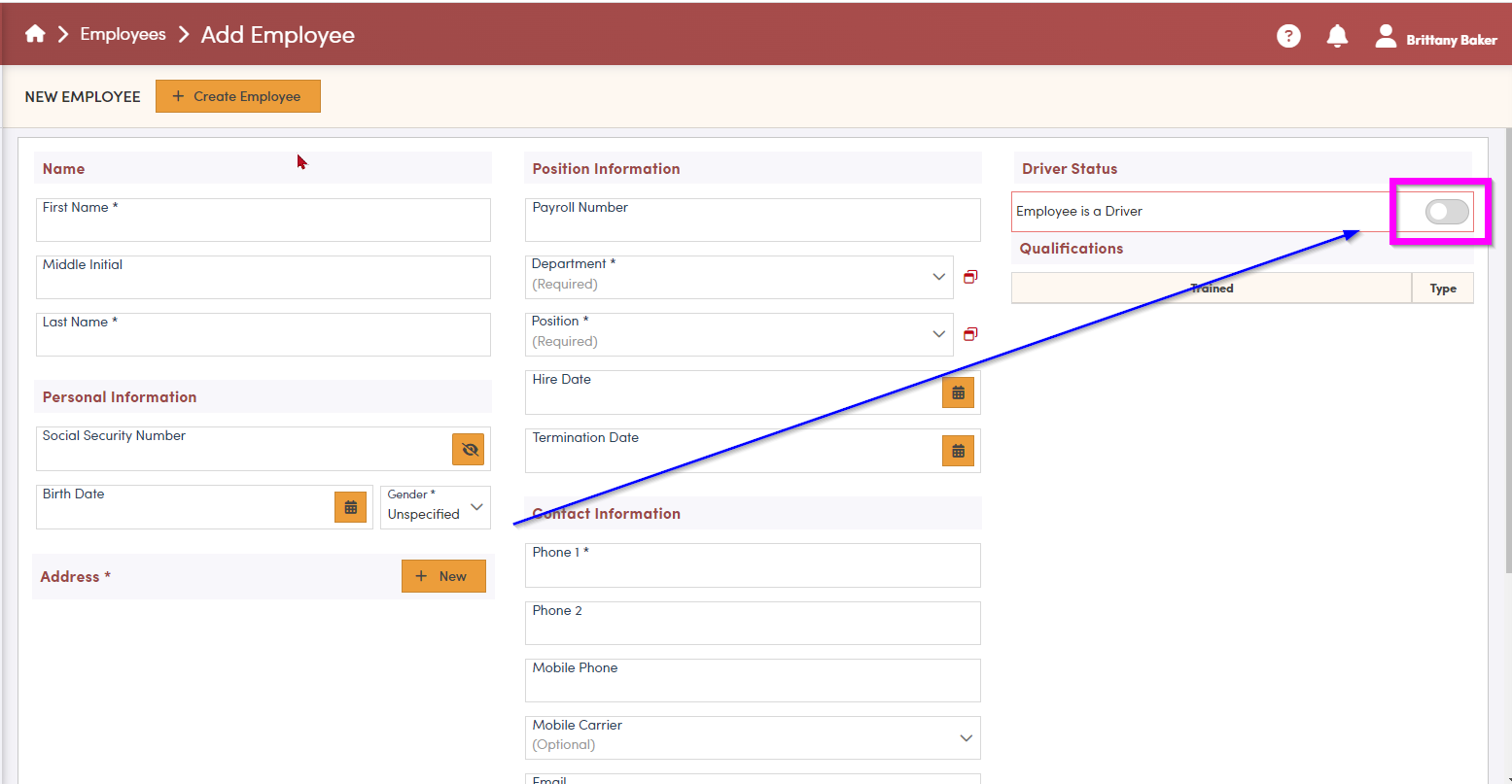 ***Important! ** Mark on the right that the employee is a driver, so all the required fields for Drivers are visible.