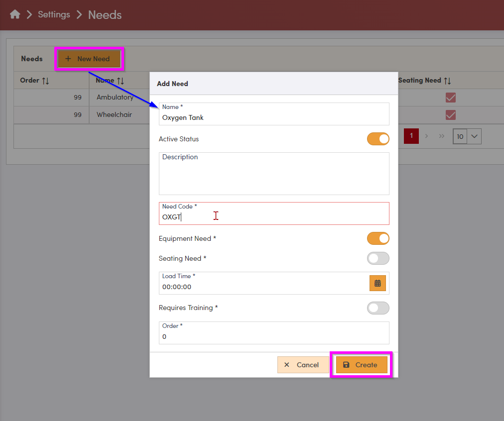 Be sure to mark whether or not you're creating a Seating Need or Equipment Need. Seating Needs indicate what kind of Seat a passenger will occupy in a vehicle.