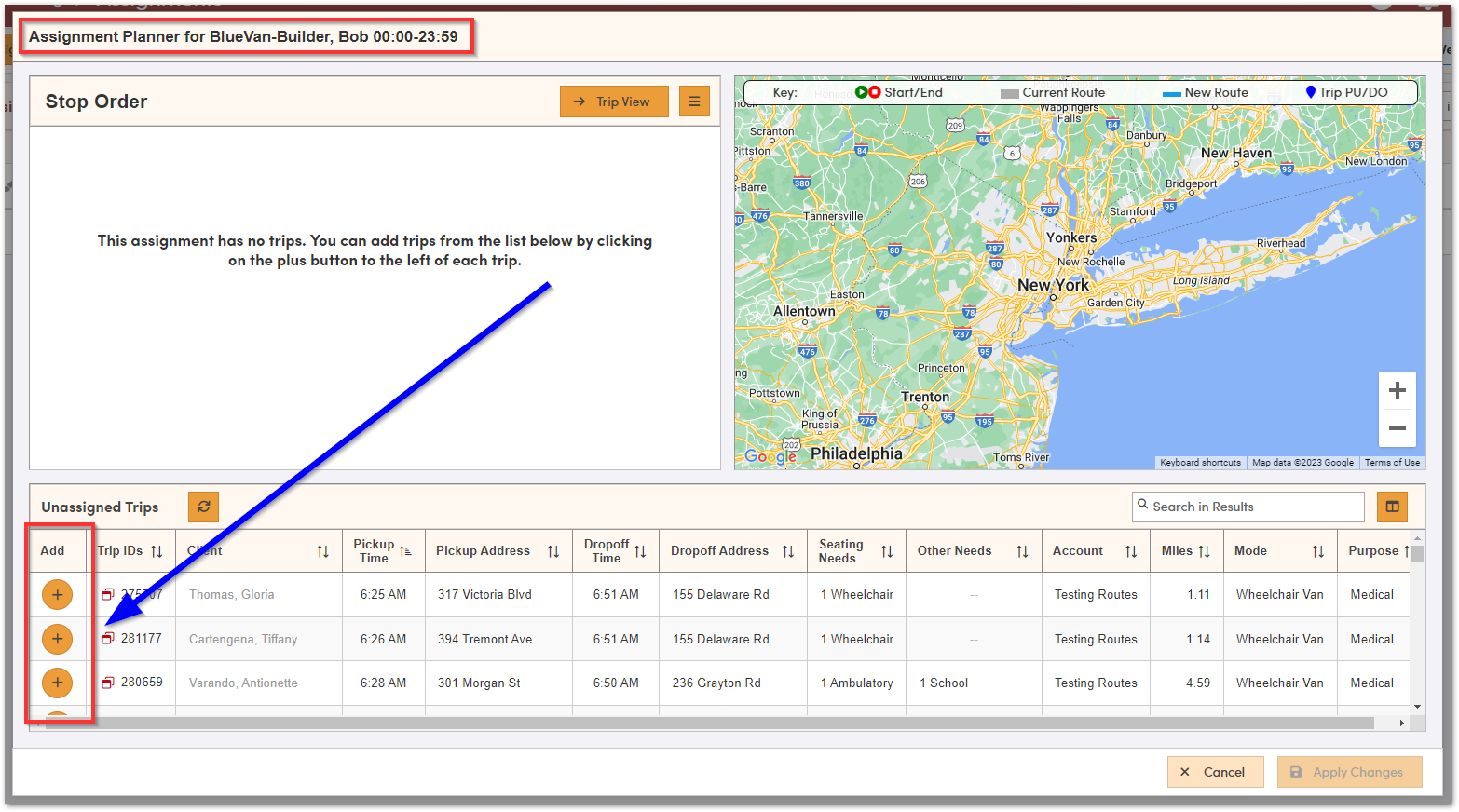 When the Assignment Planner screen loads, you'll see the Assignment you're working on at the top, any trips that have already been added to their scheduled and, any unassigned trips at the bottom.