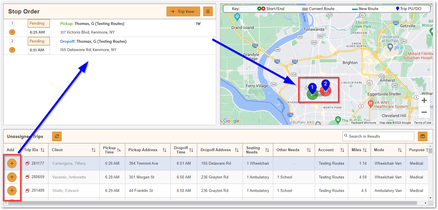 To add trips to a drivers schedule for the day, simply click the + icon next to the trip. After added, it will appear in the section above and will place the potential route on the map to the right.