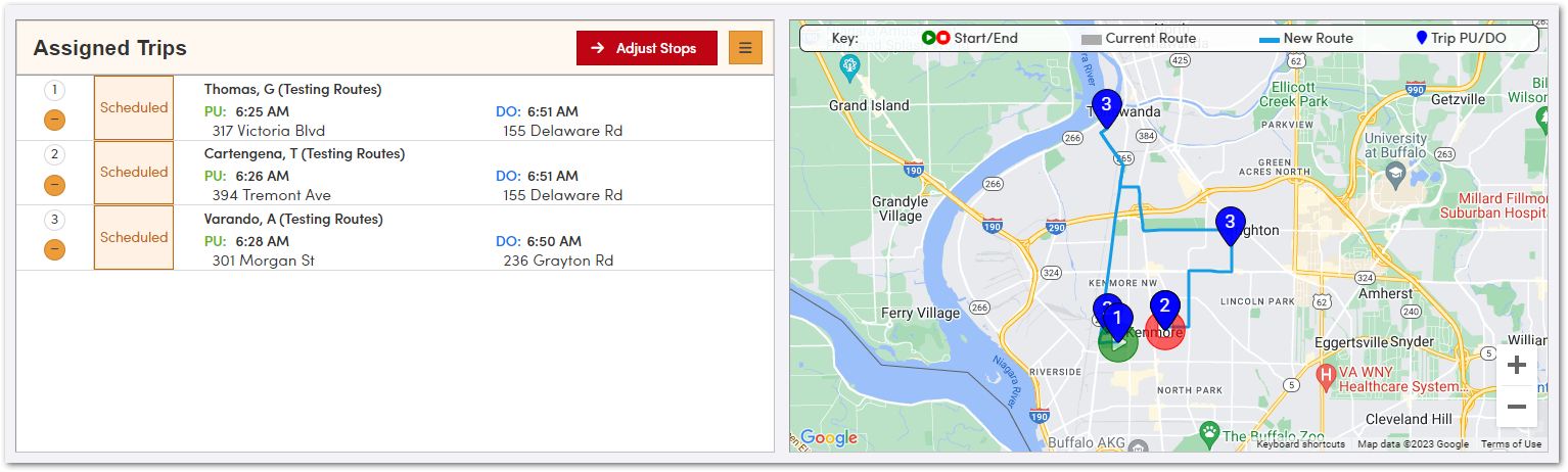 This will show you the drivers schedule in Stop View (meaning each the pickup and drop off stop are mapped out and ordered) if you'd prefer to look at the whole trip, click on Trip View.