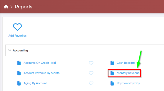 The Monthly Revenue report allows you to review the total revenue per account and account class for the selected date range.